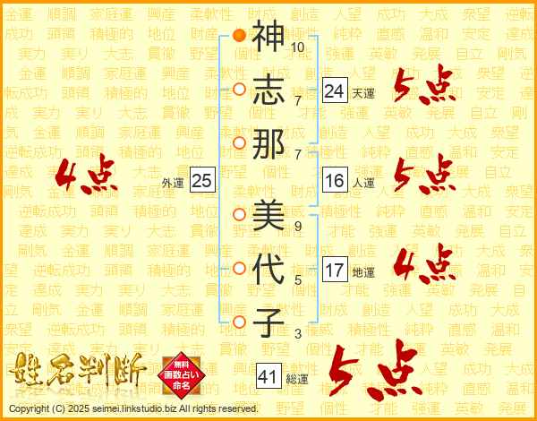 神(10画)志(7画)那(7画) 美(9画)代(5画)子(3画)