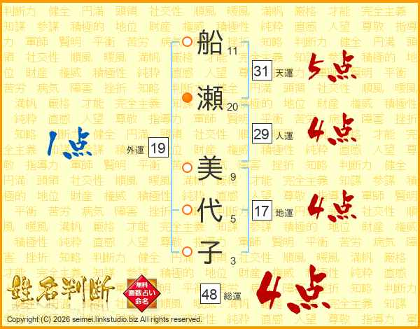 船(11画)瀬(20画) 美(9画)代(5画)子(3画)
