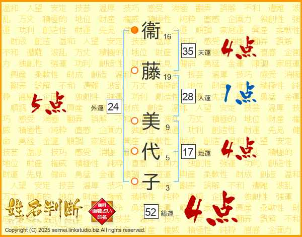 衞(16画)藤(19画) 美(9画)代(5画)子(3画)