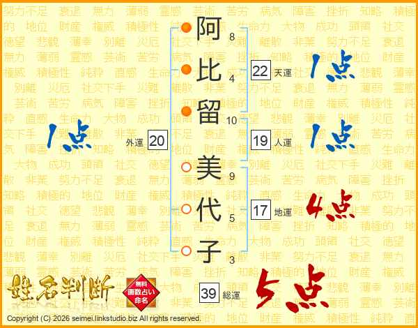 阿(8画)比(4画)留(10画) 美(9画)代(5画)子(3画)