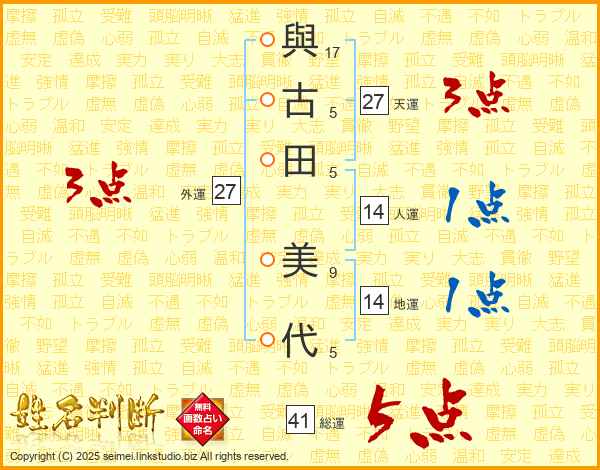與(17画)古(5画)田(5画) 美(9画)代(5画)