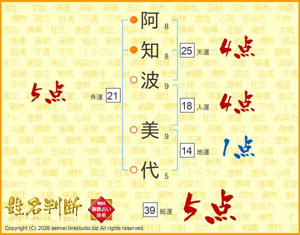 阿(8画)知(8画)波(9画) 美(9画)代(5画)
