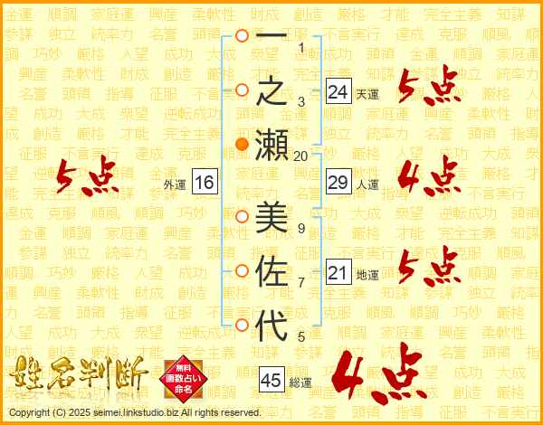 一(1画)之(3画)瀬(20画) 美(9画)佐(7画)代(5画)