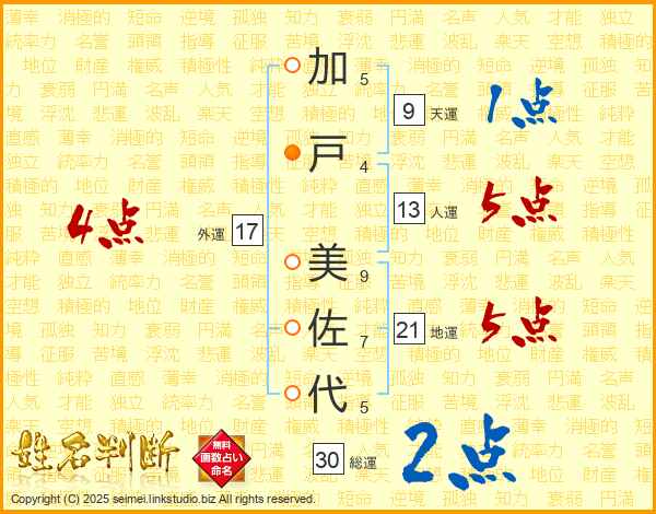 加(5画)戸(4画) 美(9画)佐(7画)代(5画)
