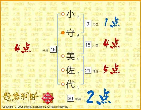 小(3画)守(6画) 美(9画)佐(7画)代(5画)