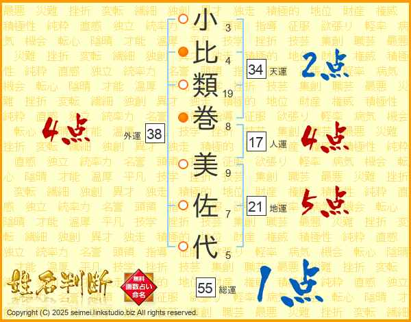 小(3画)比(4画)類(19画)巻(8画) 美(9画)佐(7画)代(5画)
