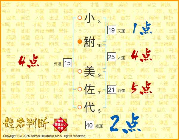小(3画)鮒(16画) 美(9画)佐(7画)代(5画)