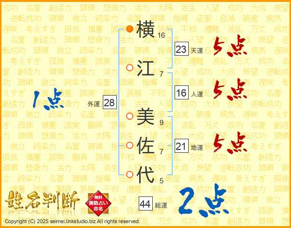 横(16画)江(7画) 美(9画)佐(7画)代(5画)