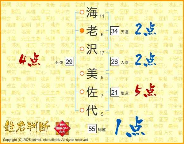 海(11画)老(6画)沢(17画) 美(9画)佐(7画)代(5画)