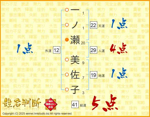 一(1画)ノ(1画)瀬(20画) 美(9画)佐(7画)子(3画)