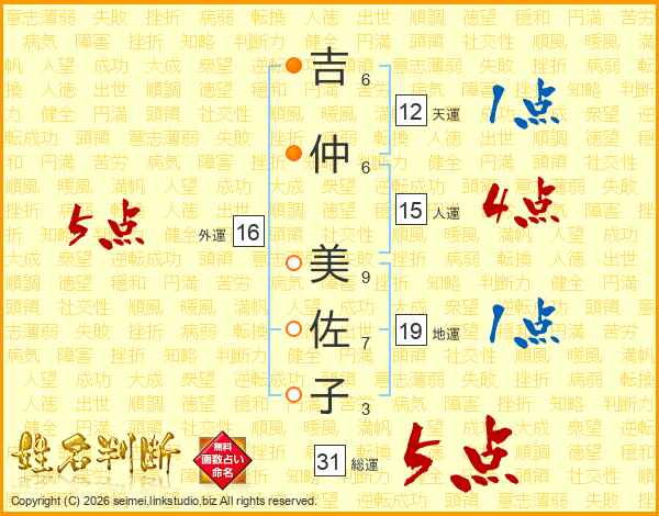 吉(6画)仲(6画) 美(9画)佐(7画)子(3画)