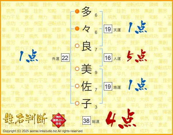 多々良美佐子さんの総運は38画の4点!