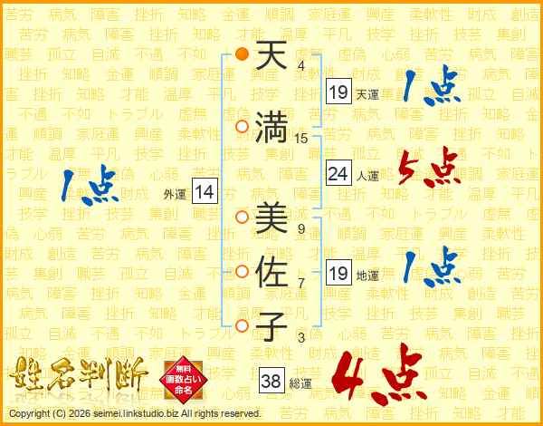 天(4画)満(15画) 美(9画)佐(7画)子(3画)
