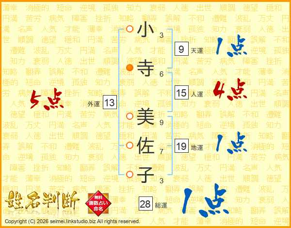 小(3画)寺(6画) 美(9画)佐(7画)子(3画)