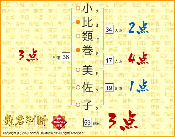 小(3画)比(4画)類(19画)巻(8画) 美(9画)佐(7画)子(3画)