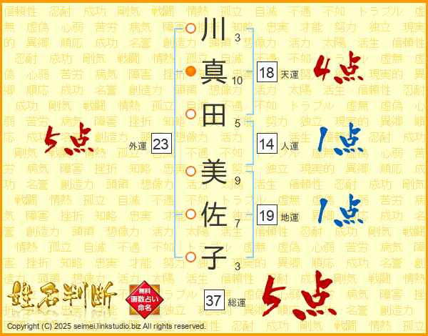 川(3画)真(10画)田(5画) 美(9画)佐(7画)子(3画)