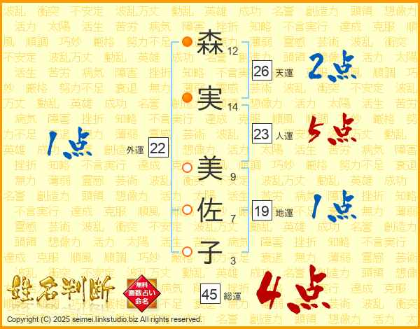 森(12画)実(14画) 美(9画)佐(7画)子(3画)