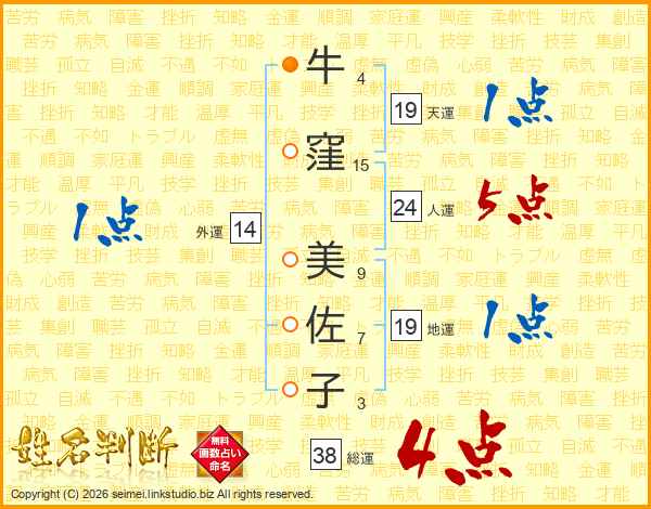 牛(4画)窪(15画) 美(9画)佐(7画)子(3画)