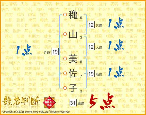 穐(9画)山(3画) 美(9画)佐(7画)子(3画)