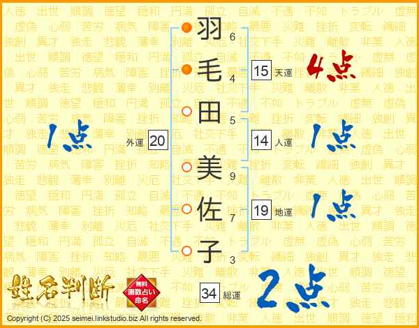 羽(6画)毛(4画)田(5画) 美(9画)佐(7画)子(3画)