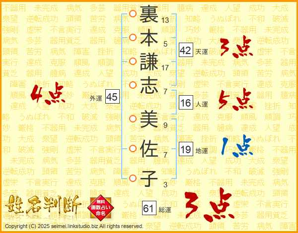 裏(13画)本(5画)謙(17画)志(7画) 美(9画)佐(7画)子(3画)