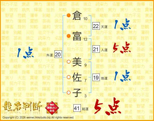 倉(10画)富(12画) 美(9画)佐(7画)子(3画)