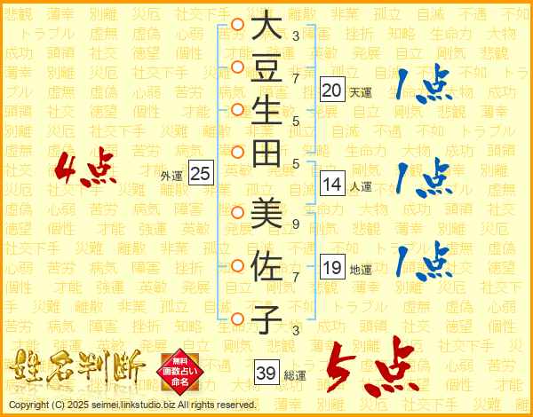 大豆生田美佐子さんの総運は39画の5点!