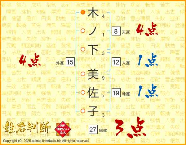 木(4画)ノ(1画)下(3画) 美(9画)佐(7画)子(3画)