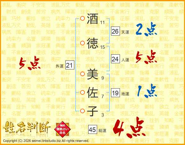 酒(11画)徳(15画) 美(9画)佐(7画)子(3画)