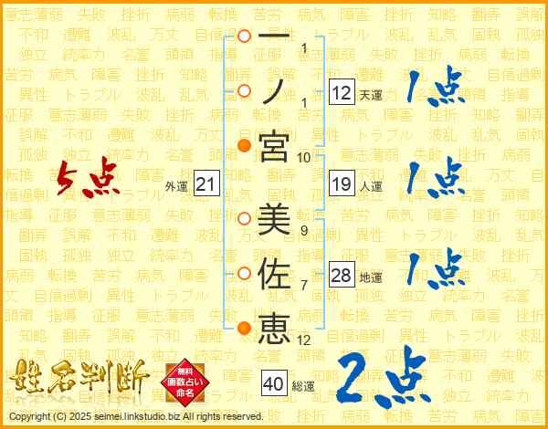 一(1画)ノ(1画)宮(10画) 美(9画)佐(7画)恵(12画)