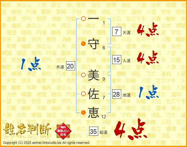一(1画)守(6画) 美(9画)佐(7画)恵(12画)