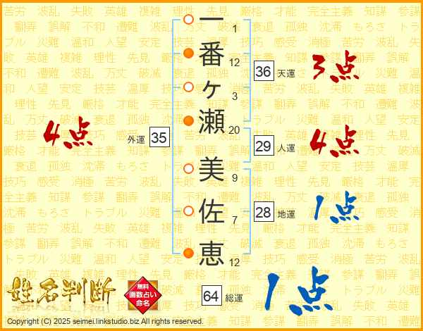 一(1画)番(12画)ヶ(3画)瀬(20画) 美(9画)佐(7画)恵(12画)