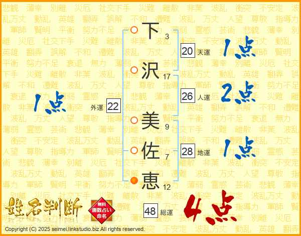 下(3画)沢(17画) 美(9画)佐(7画)恵(12画)