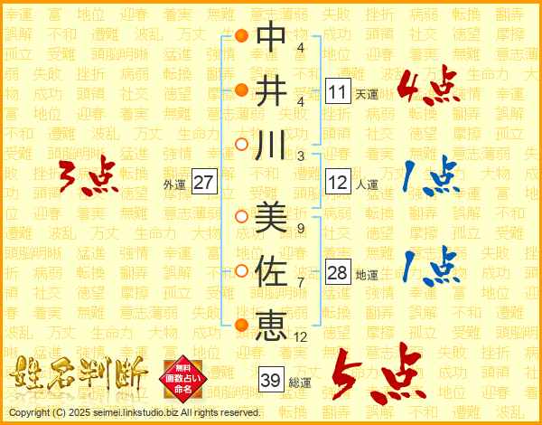 中(4画)井(4画)川(3画) 美(9画)佐(7画)恵(12画)