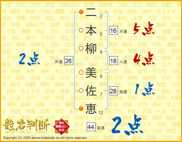 二(2画)本(5画)柳(9画) 美(9画)佐(7画)恵(12画)