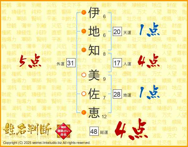 伊(6画)地(6画)知(8画) 美(9画)佐(7画)恵(12画)