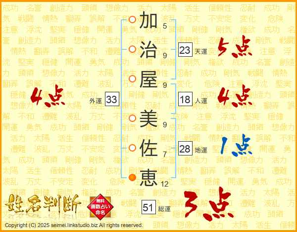 加(5画)治(9画)屋(9画) 美(9画)佐(7画)恵(12画)