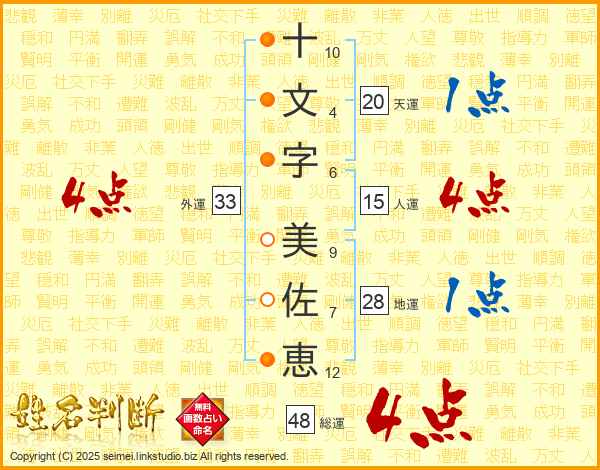 十(10画)文(4画)字(6画) 美(9画)佐(7画)恵(12画)