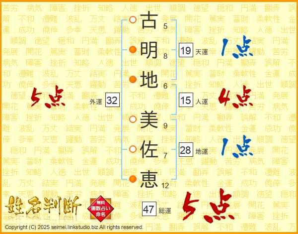 古(5画)明(8画)地(6画) 美(9画)佐(7画)恵(12画)