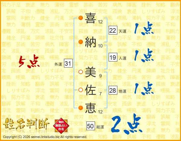 喜(12画)納(10画) 美(9画)佐(7画)恵(12画)