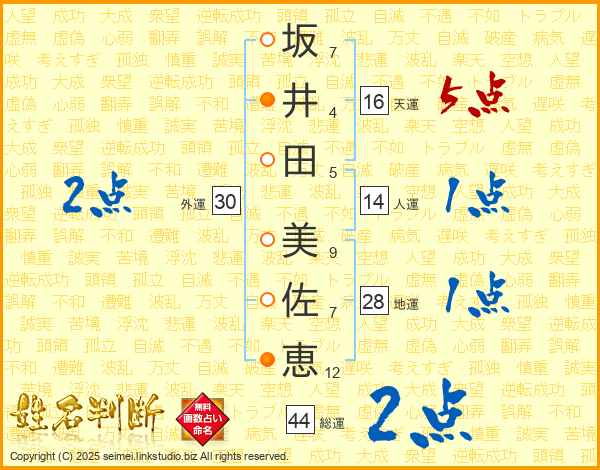 坂(7画)井(4画)田(5画) 美(9画)佐(7画)恵(12画)