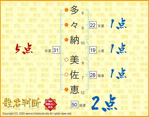 多(6画)々(6画)納(10画) 美(9画)佐(7画)恵(12画)