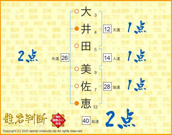 大(3画)井(4画)田(5画) 美(9画)佐(7画)恵(12画)
