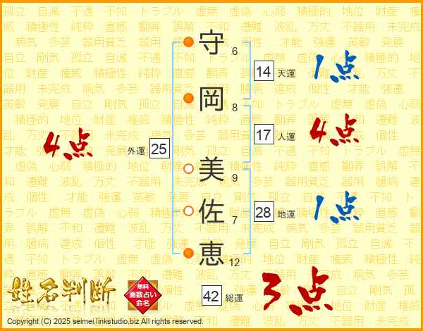 守(6画)岡(8画) 美(9画)佐(7画)恵(12画)