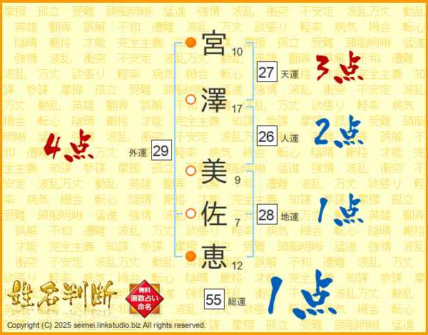宮(10画)澤(17画) 美(9画)佐(7画)恵(12画)