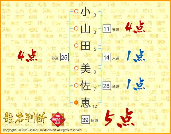 小(3画)山(3画)田(5画) 美(9画)佐(7画)恵(12画)