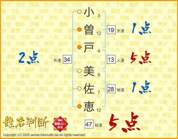 小(3画)曽(12画)戸(4画) 美(9画)佐(7画)恵(12画)