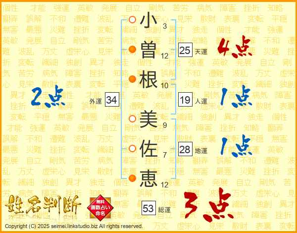 小(3画)曽(12画)根(10画) 美(9画)佐(7画)恵(12画)
