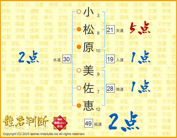 小(3画)松(8画)原(10画) 美(9画)佐(7画)恵(12画)