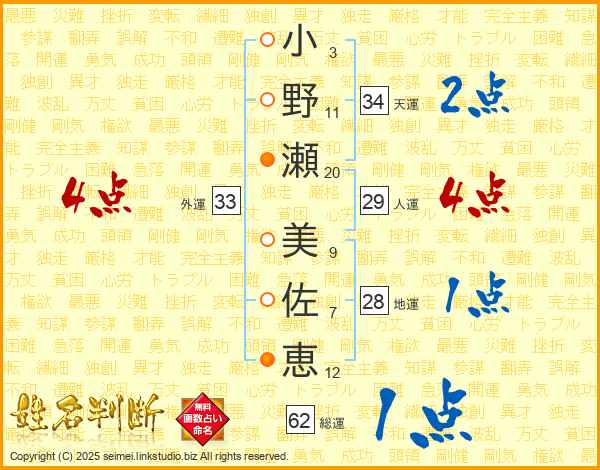 小(3画)野(11画)瀬(20画) 美(9画)佐(7画)恵(12画)